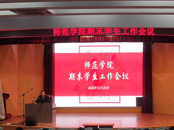 为了更好地迎接即将到来的期末考试和假期,师范学院于12月25日中午在德润楼报告厅召开2019级期末学生工作会议。本次会议由2019级辅导员赵炜主讲,2019级全体学生参加会议。