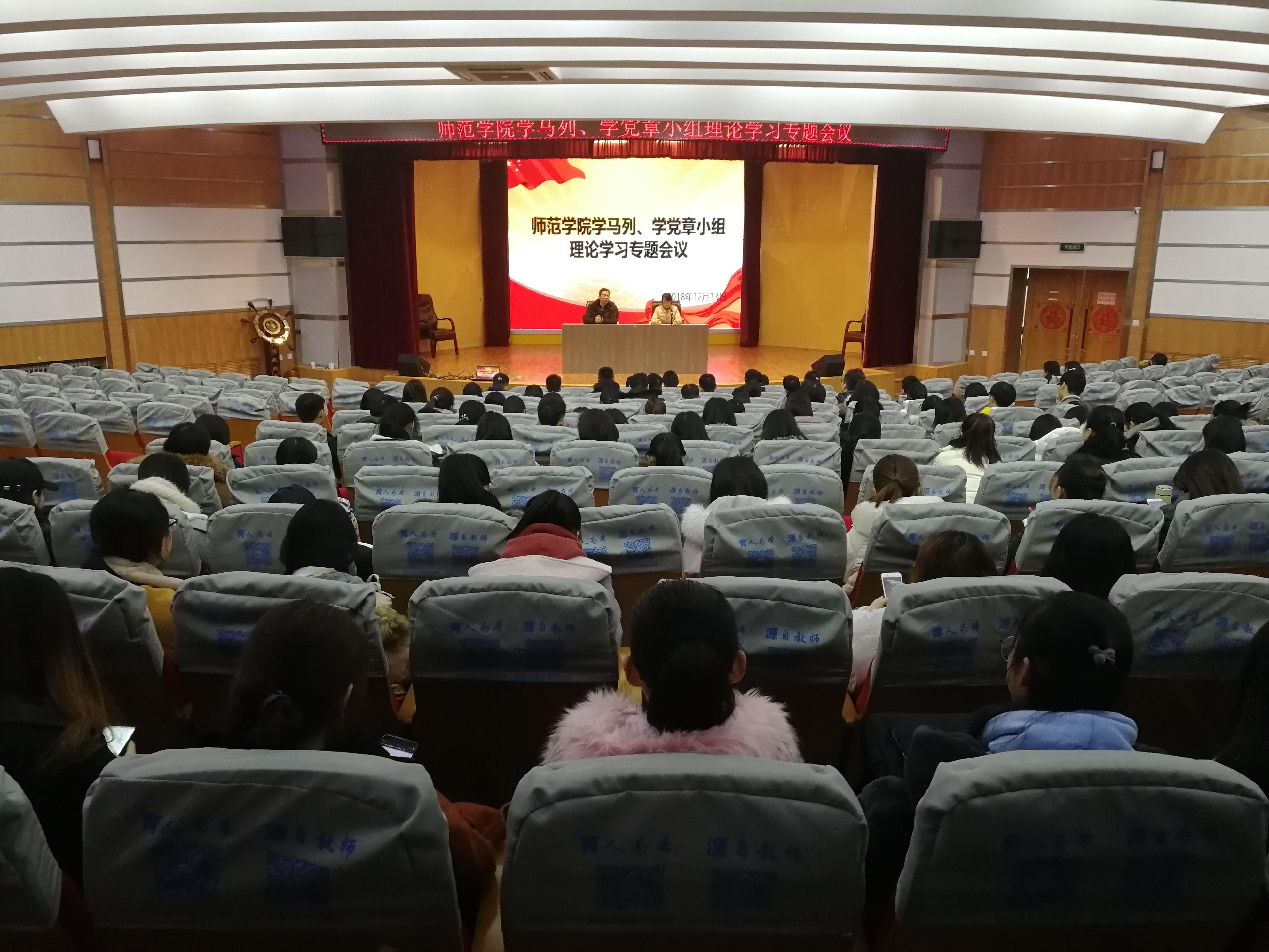 2018年12月13日中午,师范学院“学马列、学党章”小组理论学习专题会议在师范学院学术报告厅举行,学工办主任赵炜,团委书记李萌萌,以及19个两学小组的全体成员参加了此次会议。