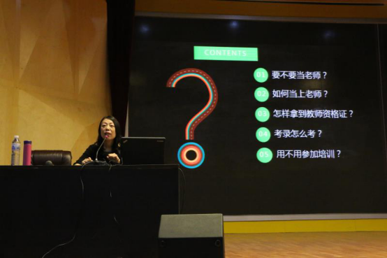 此次讲座的主讲人是士博教育特级教师郭启维。郭老师围绕同学们最关心的要不要当老师、如何当上老师、怎样取得教师资格证以及如何考录教师这几个问题作出了认真回答,尤其是对于如何考录教师做了更加详细的讲解。她结合2017年考录的真题对考试情况进行了详细的梳理和分析,让同学们对考试内容有了大致了解。