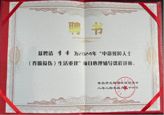 在启动仪式上,我院学工办主任姜彬、张宁、李幸被聘为2024年“中途残障人士(脊髓损伤)生活重建”项目心理辅导课程教师。“心启航”青年志愿服务队成为其合作伙伴,为残障人士提供专业的心理辅导。