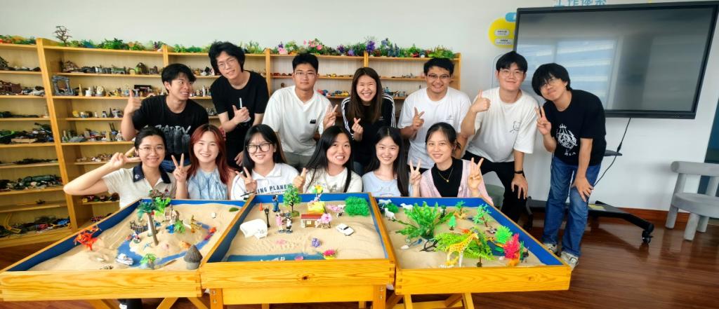 实践过程中,六次交互式团体沙盘体验成为同学们深化“雁群式”协作、促进自我成长的关键环节。在沙盘世界中,每一个动作都成为无声的交流,每一次触动都开启心灵的联结。同学们通过亲身体验和相互分享,深刻练习了如何“看见”他人与“被看见”,学习在关系中如何恰当地靠近、真诚地回应,如何在团队中立足而不越界,表达而不伤人,保持自我而不失联结。同学们相互见证了彼此从初期的羞涩拘谨到逐渐开朗自信,从独自摸索到主动寻求协作、配合默契的转变。一位同学在沙盘复盘时由衷感叹:“原来和大家一起完成一件事,比自己做有意思多了!”这正是对“雁群式”协作模式价值最生动的肯定。