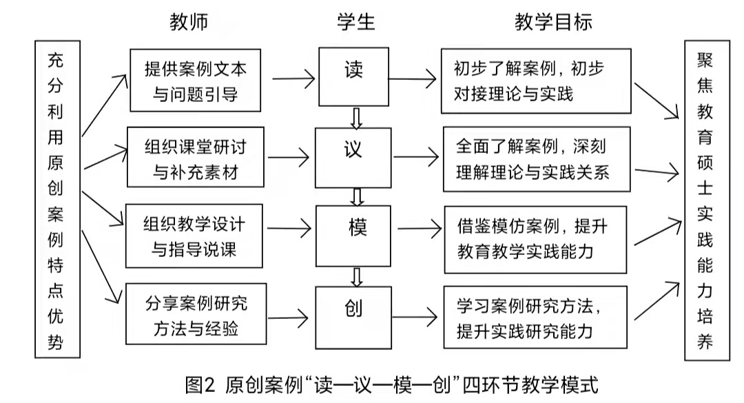 “四步递进”教学模式,就是在原创案例教学中,突出原创案例的核心作用,构建“读—议—模—创”四环节教学模式,以实现教育硕士培养的多重目标。该教学模式包括四个环节,首先,在课前布置学生预习案例文本,并提出相关思考问题引导学生阅读和思考;其次,在课堂上不断丰富案例素材,组织学生深度研讨;再次,让学生模仿借鉴案例经验,进行教育教学设计或进行说课;最后,介绍案例开发过程与分享编写经验,布置学生课后研发和创编案例。
