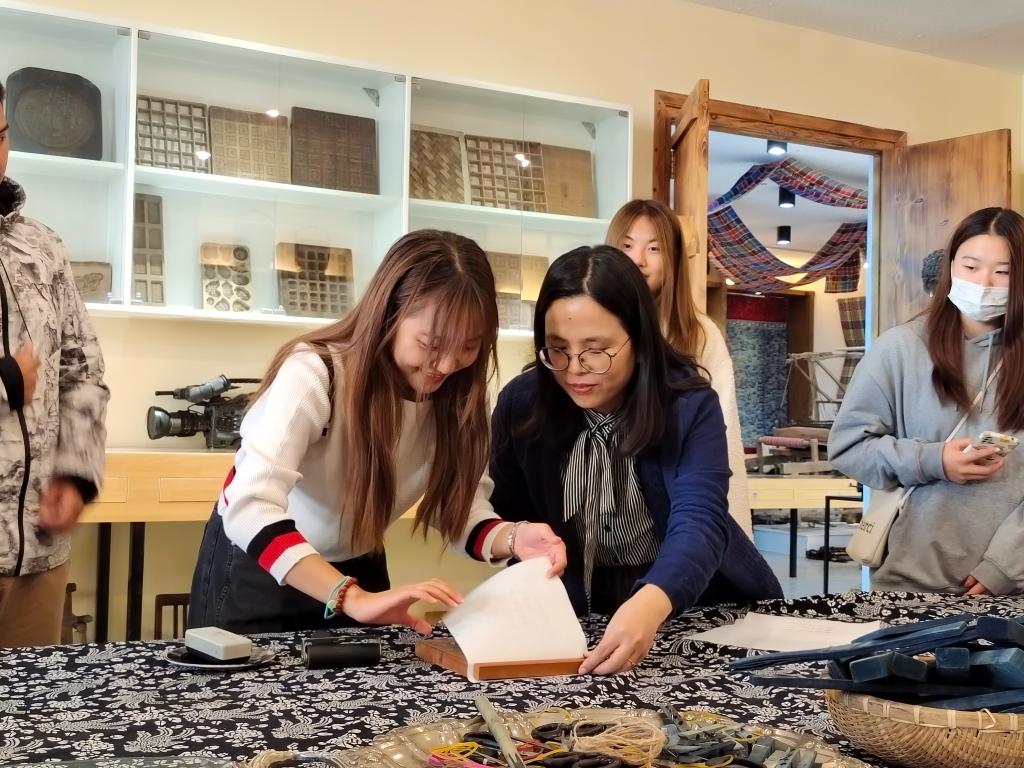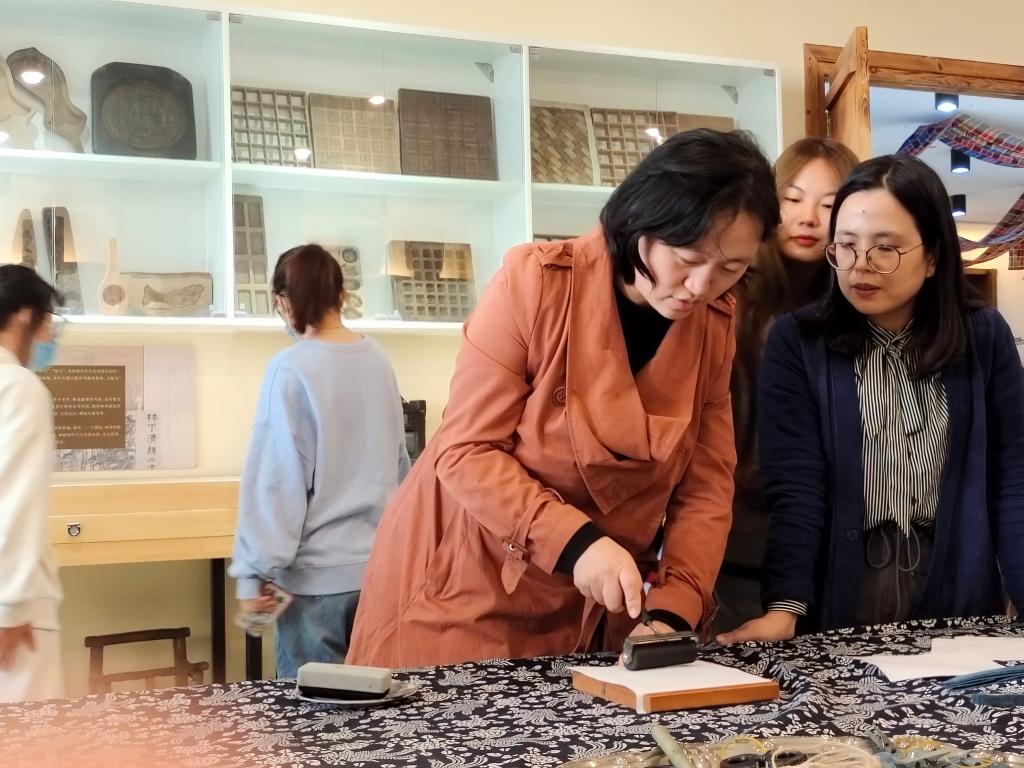 纵观古今,中华大地上涌现出一批又一批璀璨的文化瑰宝,中华上下五千年的历史也正是因为有了这些瑰丽的宝物而变得更加动人。11月3日,2021级学前教育系幼师班学生在孙欣老师的带领下,通过中国文化概论的课堂,有幸走入青岛大学民间工艺美术馆,亲眼目睹历史遗留的礼物,领略文化的魅力。此次活动,特邀美术学院彭卫丽老师为同学们示范与讲解。在体验式实践研学中,同学们得以近距离地触摸民间文化。