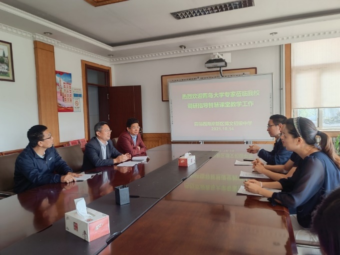 10月14日,我院教育技术系师生赴西海岸新区博文初级中学进行智慧课堂教学应用调研。博文初级中学校长徐全启、党支部书记胡学发、副校长葛志胜、教导主任崔桂波、教师代表,教育技术系主任杨进中、王兴华教授、田雪葳博士、教育技术系部分研究生参加了调研活动。