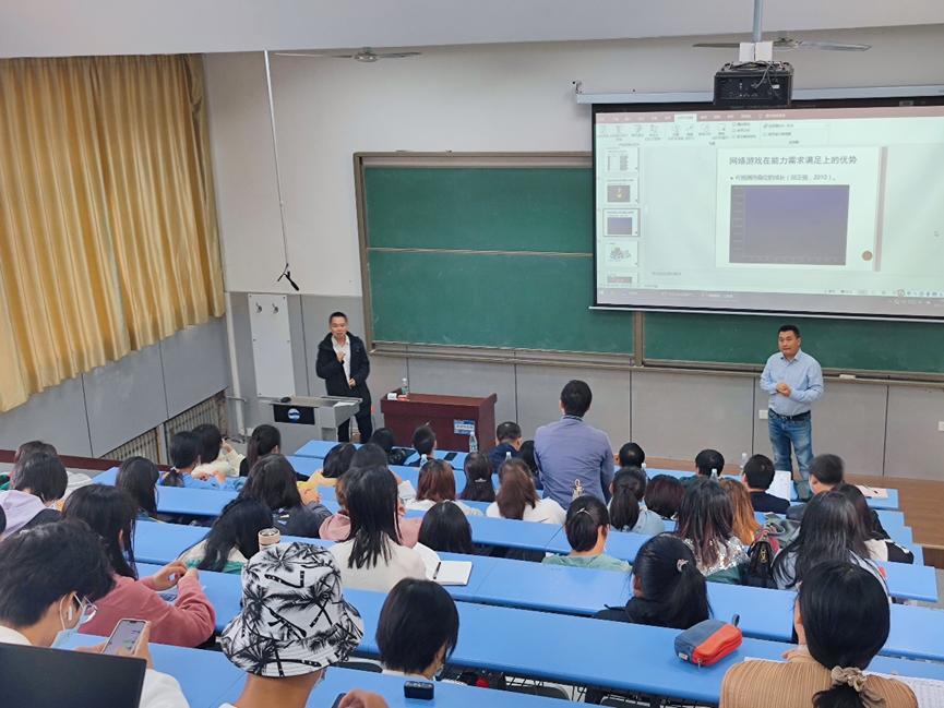 活动的第一环节,信阳师范学院魏华副教授应邀做了主题为《网络游戏,让我欢喜让我忧》的学术讲座。讲座由心理学系副主任宫准教授主持,我院众多师生以及青岛市教育学会心理健康教育专业委员会的老师们聆听了此次讲座。魏华以热门网络游戏为切入点,向同学们讲述了自己的游戏人生和学术人生,介绍了网络游戏风靡的原因、网络游戏成瘾的原因及预防措施,进而通过理性地分辨和思考让同学们真正了解网络游戏这一事物本身性质。在此基础上,他提出防止沉迷于网络游戏的建议,帮助同学们树立健康、理智应对网络游戏的态度,防止沉迷其中。讲座结束后,魏华和师生们展开了关于报告内容的深入交流,并对师生提出的问题做出了精准且详尽的解答,