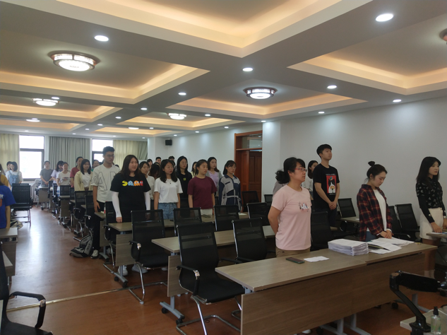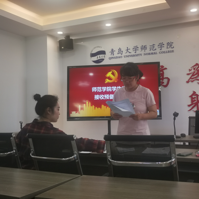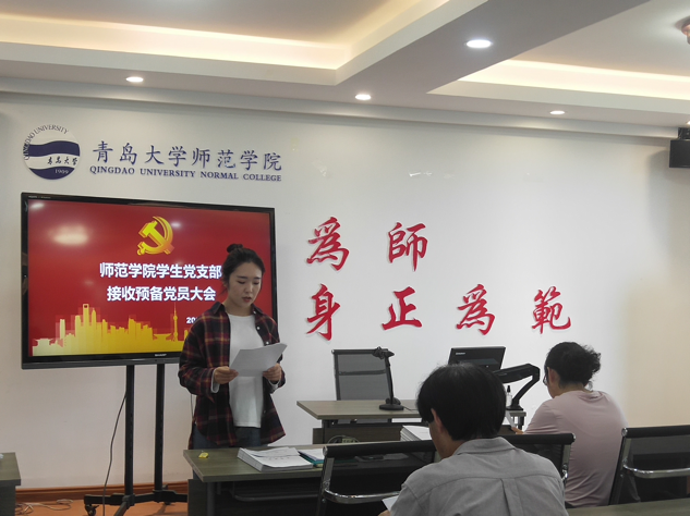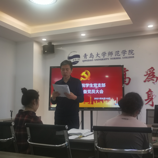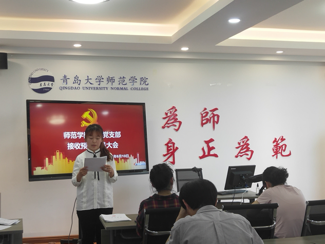 6月10日,师范学院学生党支部在德润楼201会议室召开接收预备党员大会。本次会议由学生党支部宣传委员张宁主持,学生党支部书记赵炜出席,学院学生党支部全体党员及预备党员参加本次会议。