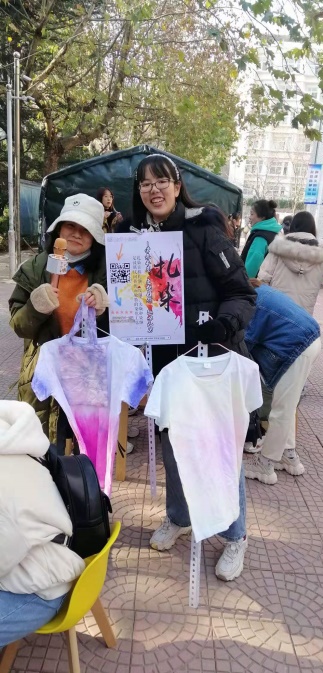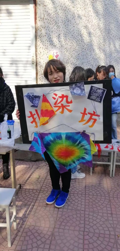 色彩丰富的扎染让同学们也纷纷想自己动手制作一下,先来块手绢试试手,再挑战下T恤和布袋。