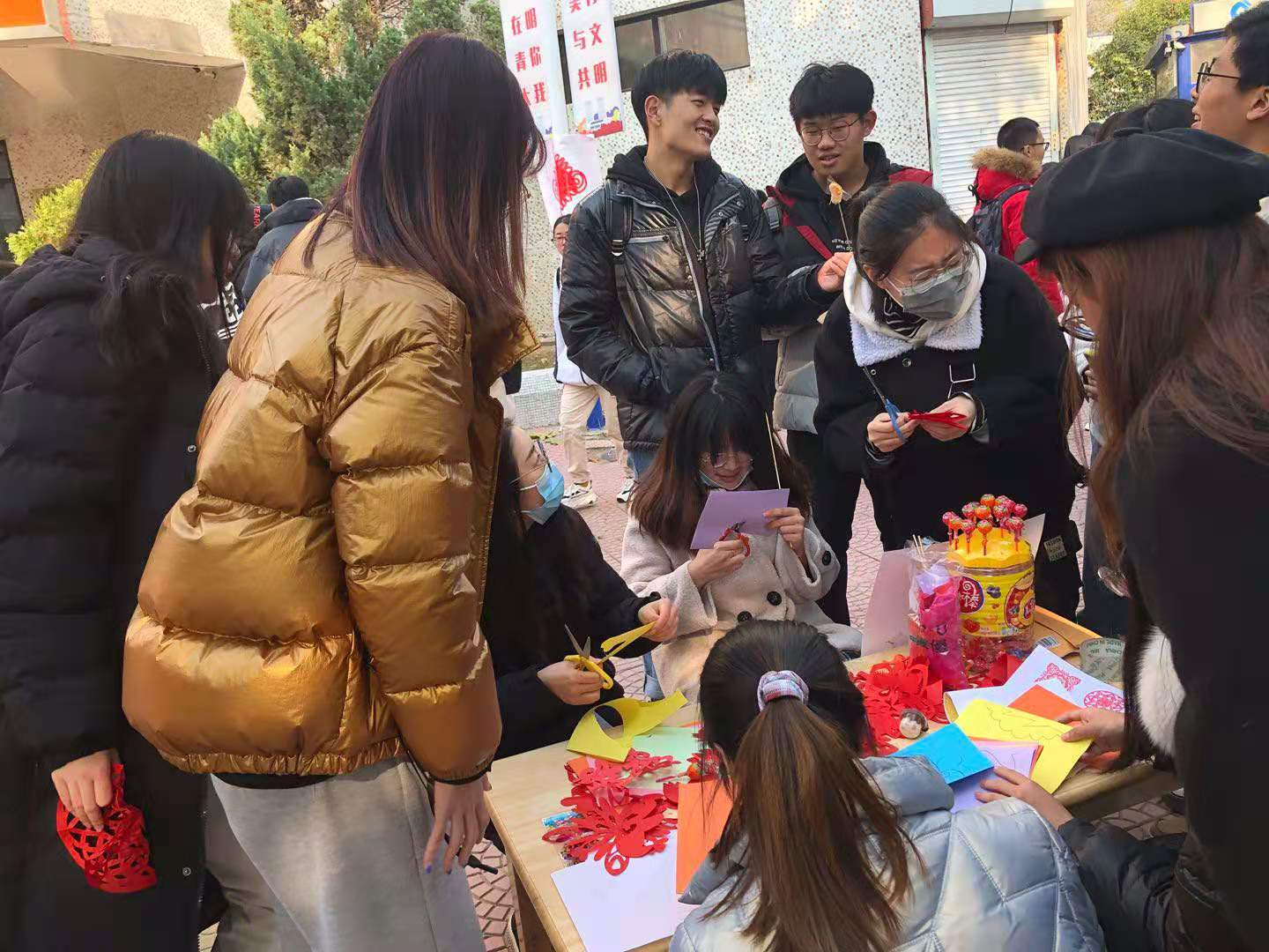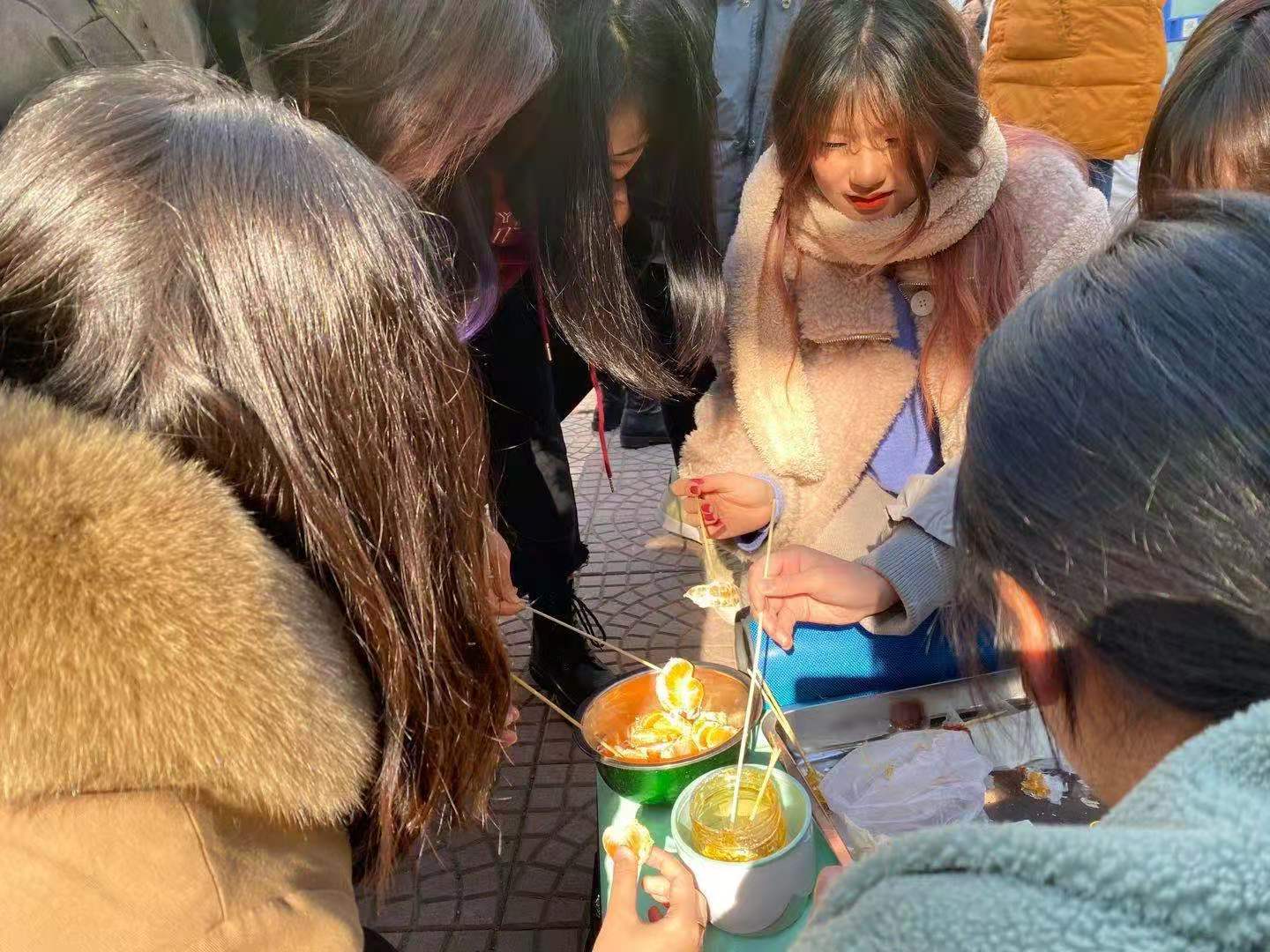 最最火爆的摊位当属糖葫芦啦!色香味俱全的糖葫芦和糖桔子,从一开始就吸引了同学们的目光。从活动到结束,这个小组就没有停过工作。因为供不应求,现场还补了两次货。
