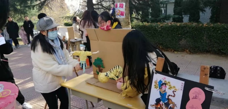 同学们演的皮影戏和木偶戏,不仅吸引了同学观赏,连食堂的工作人员都驻足拍照。