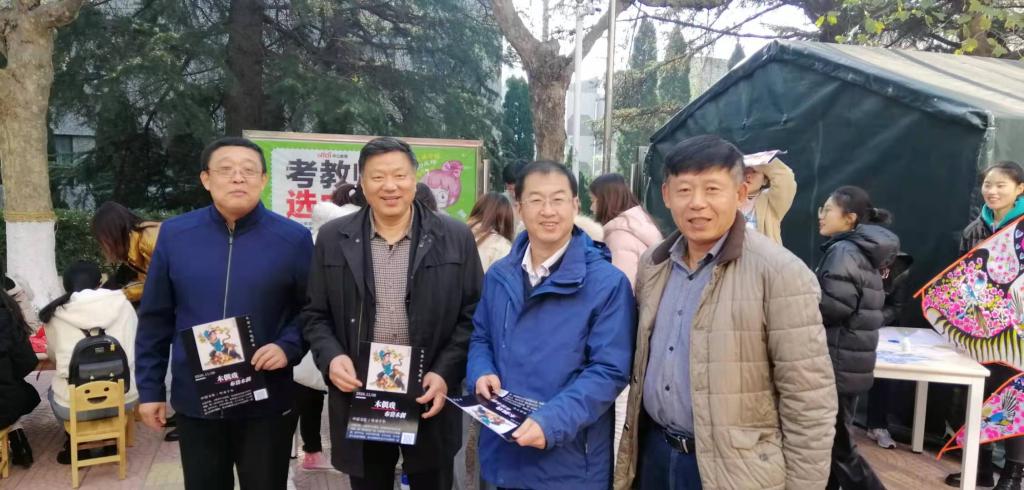 师范学院党委书记宋贵欣、院长李福华、副书记王成海、副院长刘启民一早就来给大家捧场、打气,他们饶有兴趣地在“非遗摊位”前一一查看,为同学们这种不畏严寒、积极的学习态度和非遗活动的意义、丰富的形式纷纷点赞。