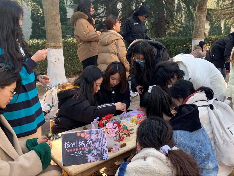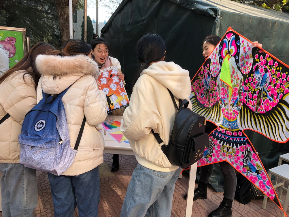 经过半个月的精心准备,非遗宣传展示活动在期盼中顺利召开。活动内容丰富多彩,包括儿时最爱的糖葫芦,能让我们放飞梦想的风筝,长辈们最熟悉的剪纸,民俗活动中必备的花灯和灯谜,色彩鲜艳的扎染,孩子爱玩的泥塑,人气火爆的中国结,搞怪多趣的脸谱,结合现代3D打印技术的景泰蓝,剧情跌宕起伏的皮影戏和木偶戏,饱含淑女情怀的绒花制作以及文雅诗意的篆刻等13种非遗活动。同学们分成了一个个“小摊位”,不仅展示了提前制作好的非遗作品,而且在现场教观众门体验制作过程。