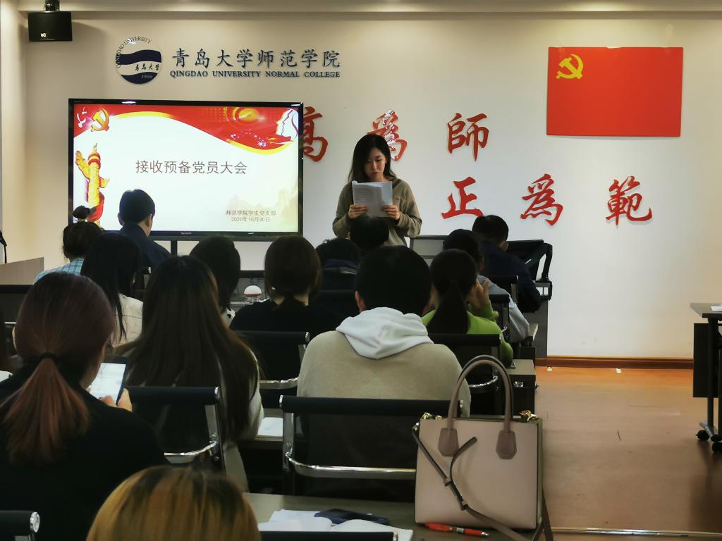 10月30日中午,师范学院学生党支部在德润楼201会议室召开师范学院发展新党员大会。学院党委副书记王成海、校党委组织员徐炜光、全体党员和党员发展对象参加本次活动。会议由学生党支部书记赵炜主持。