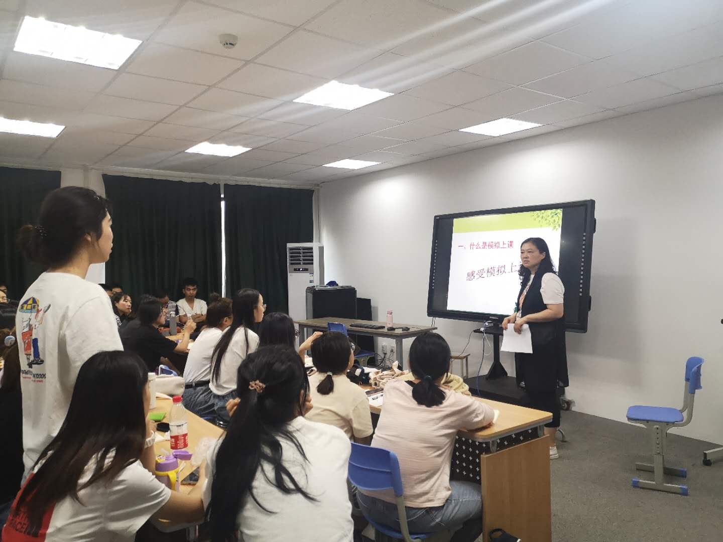 李艳首先播放了一段优秀模拟讲课视频作为导入,让同学们了解并记录优秀模拟讲课的基本流程,感受并观察模拟讲课的基本特征。讲解了模拟讲课的定义,并着重强调了模拟讲课的三个重点:教学中的重难点突破,板书设计,教师讲课的语言特点。然后将模拟讲课分成四个阶段,分别是导入新课,探究问题,练习题目,小结。强调了在模拟讲课过程中,虽然没有学生,但是老师仍然要语音饱满,自信,师生互动三大注意问题。这些内容都很好地帮助即将踏上实习岗位的同学们学习了模拟讲课并让大家更好的理解模拟讲课的内涵,同学们受益匪浅。最后李艳老师又为学生们播放了另一段优秀模拟讲课,让同学们寻找其亮点和不足,巩固刚刚学过的模拟讲课知识。