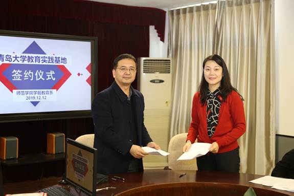 12月12日下午,师范学院学前教育专业在德润楼301会议室举行教育实践基地签约仪式暨实践专家教师聘请仪式。来自青岛市实验幼儿园、市南区实验幼儿园、市北区实验幼儿园、崂山实验幼儿园等12所岛城知名省示范幼儿园及实践专家教师、师范学院院长李福华教授、副院长马勇军教授,学前教育系全体教师和部分学生出席了会议。会议由学前教育系教授孙玉洁主持。