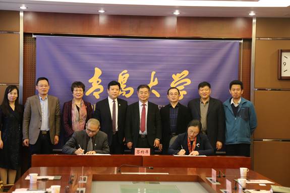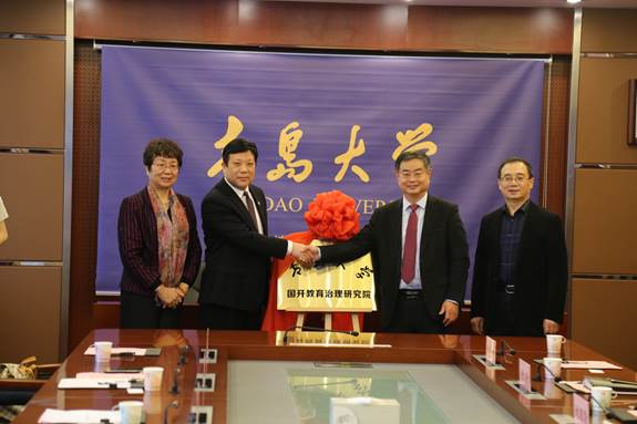 青岛大学合作发展处处长张燕、国开教育集团副总裁兼国际教育事业部总监肖锡铭代表双方签约。夏东伟校长、王鲁刚董事长为研究院揭牌。