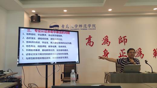 马勇军副院长作了《师范专业认证与师范学院发展》的专题报告,报告共四个部分,一、专业认证前期准备情况,二、专业认证准备工作的体会,三、专业认证准备中暴露的问题,四、借认证契机推进专业发展。马勇军布置了下一阶段工作任务,要求新学期一定做好小学教育专业认证前的准备工作,全面细化各项工作,精细修改自评报告,确保师范专业认证工作有序开展。