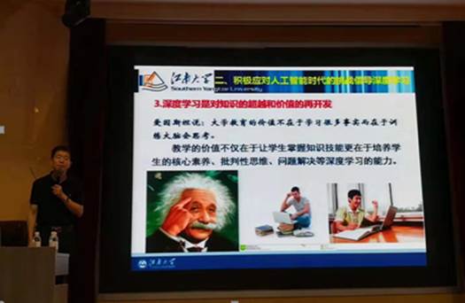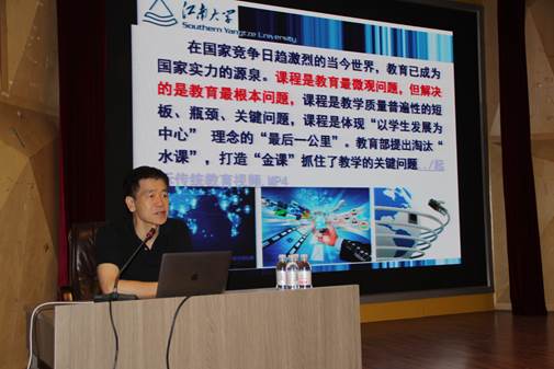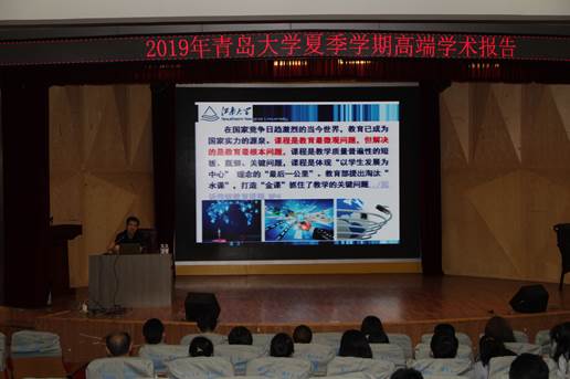 7月4日上午,青岛大学师范学院2019夏季学期高端学术报告会第二讲在师范学院报告厅举行。江南大学陈明选教授为师范学院师生作了题为《互联网背景下促进深度学习的“金课”建设》的讲座。师范学院教育技术系主任李国建主持讲座。师范学院各系师生及学校部分学院师生共150余人聆听了讲座。