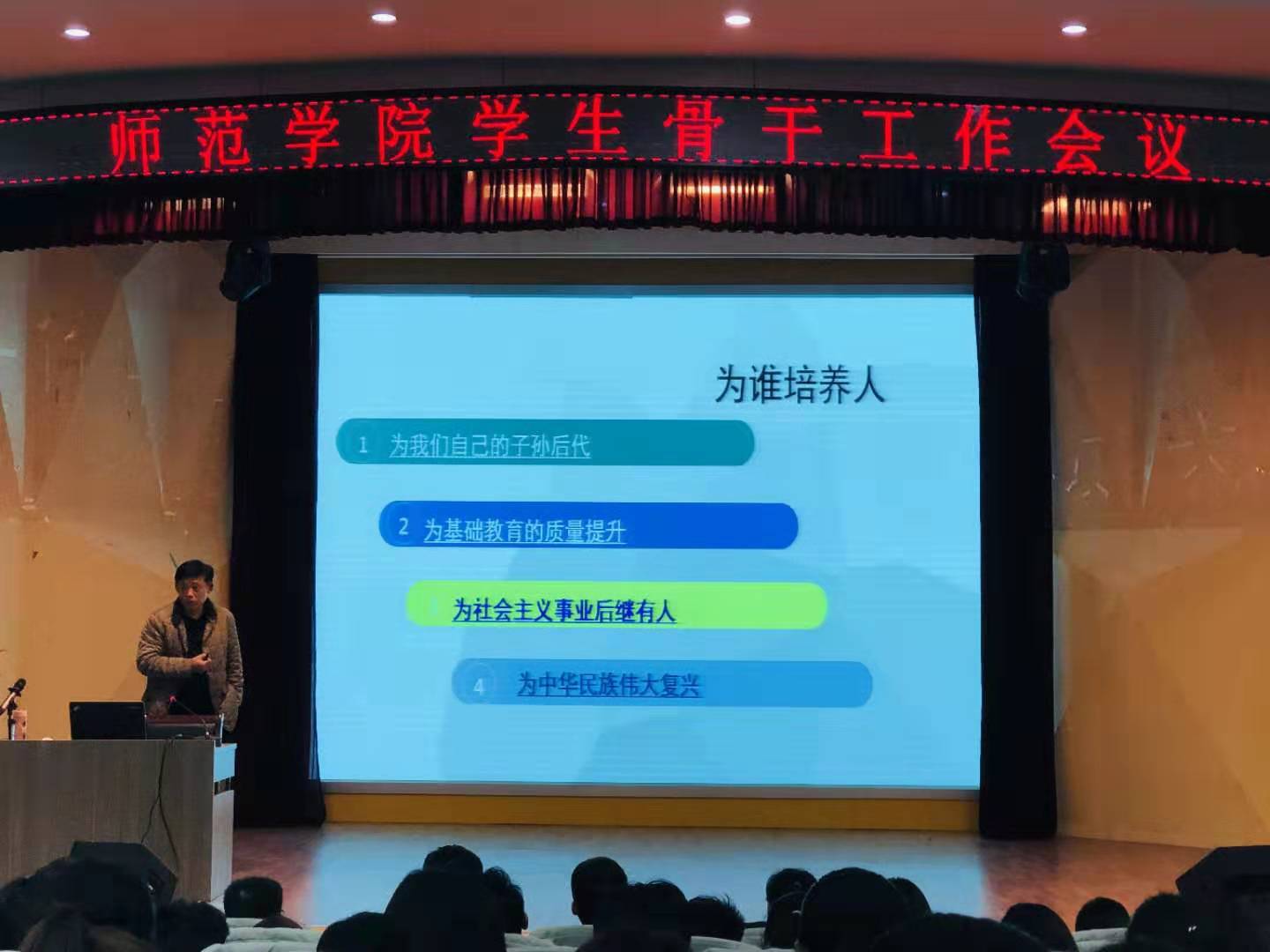 2019年3月7号下午,师范学院在报告厅召开学生骨干工作会议。学院党委副书记王成海、团委书记李萌萌及学院全体学生党员和所有学生干部参加此次会议。学工办主任赵炜老师主持会议。