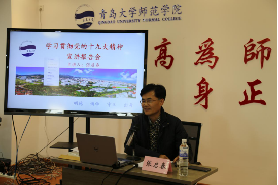 12月7日下午,师范学院学习贯彻党的十九大精神宣讲报告会在德润楼201会议室举行。青岛大学宣讲团成员、党委宣传部副部长兼新闻中心主任、报社社长张启春应邀来我院做主题宣讲,学院全体教工党员、部分学生党员和入党积极分子代表参加报告会。