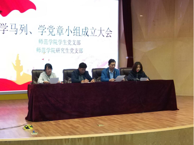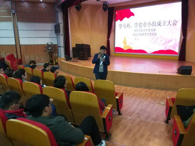 2017年11月15日18时30分,师范学院学马列、学党章小组成立大会于师范学院学术报告厅举行。师范学院党委副书记王成海、学工办主任赵炜、团委书记李萌萌和研究生党支部书记李慧玫出席了本次大会。同时参与大会的有2014-2016级各班党员、预备党员、入党积极分子以及2015-2017级各班学马列、学党章小组成员。