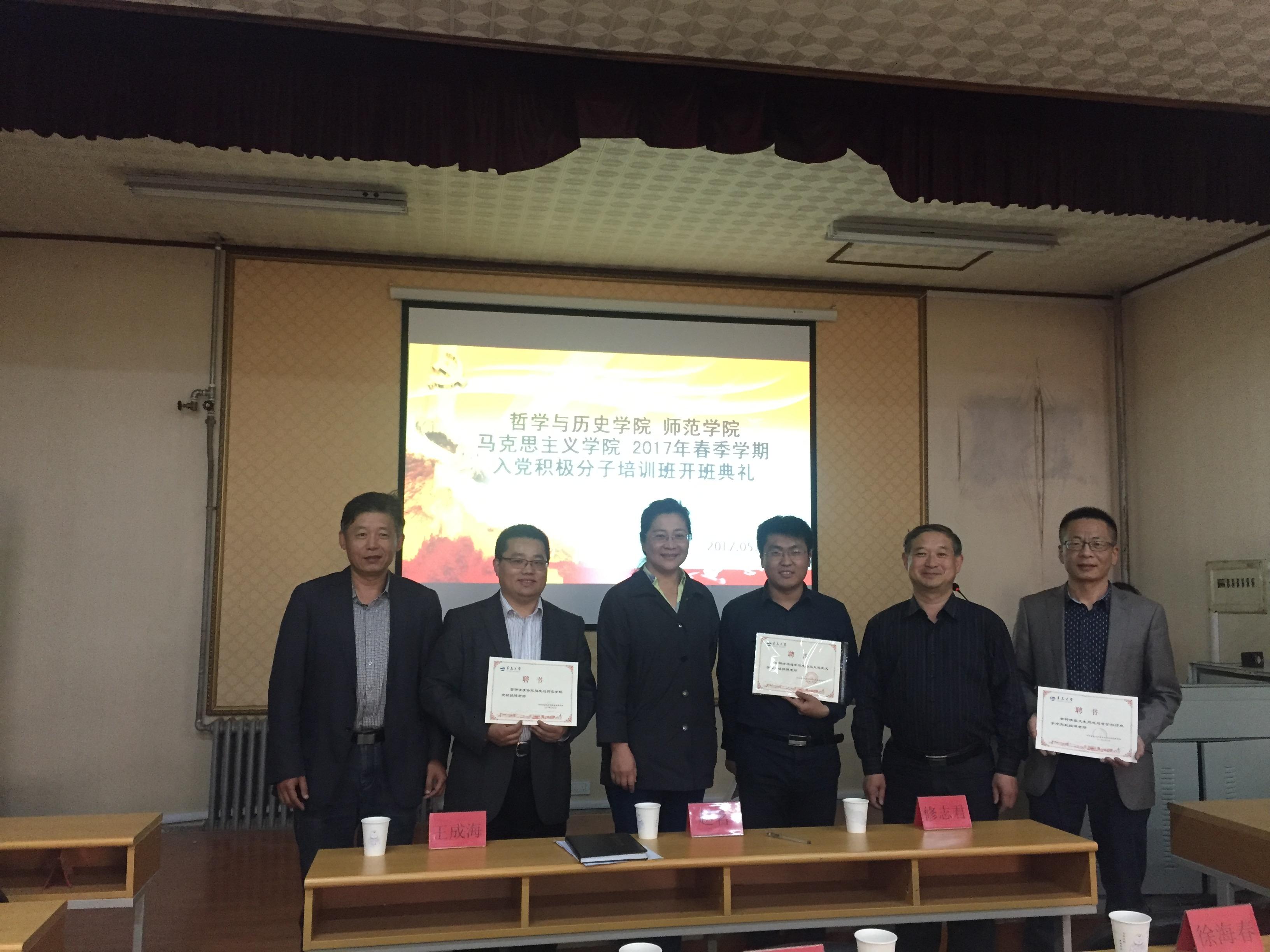 5月10日下午,哲学与历史学院、师范学院、马克思主义学院2017年春季学期入党积极分子培训班开班典礼在笃行楼205隆重举行。马克思主义学院党委书记赵茗,哲学与历史学院党委书记修志君,以及各学院党委副书记、授课老师、辅导员和全体入党积极分子参加典礼。