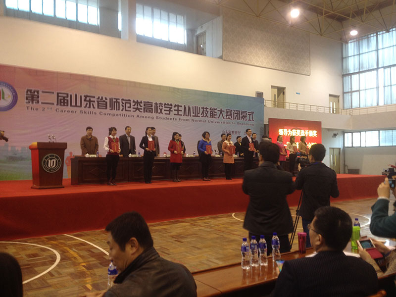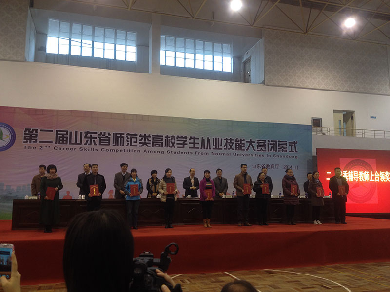 省级决赛分语文、数学、英语、物理、化学5个学科,学前、小学、初中、高中4个学段,共14个组进行,比赛项目包括说课、模拟上课、答辩三个部分。在两天的同场竞技中,由我院刘岩等13名同学组成的青岛大学代表队,不畏强手、奋勇争先,展示了娴熟规范的从教基本功,表现出了良好的精神风貌。经过激烈的角逐,我院刘岩、李晓、刘晶三名同学分获学前、初中物理、初中数学一等奖;王芳、姜静、杨慧娟三位老师获优秀指导教师奖。另有5名同学获得二等奖,4名同学获得三等奖。
