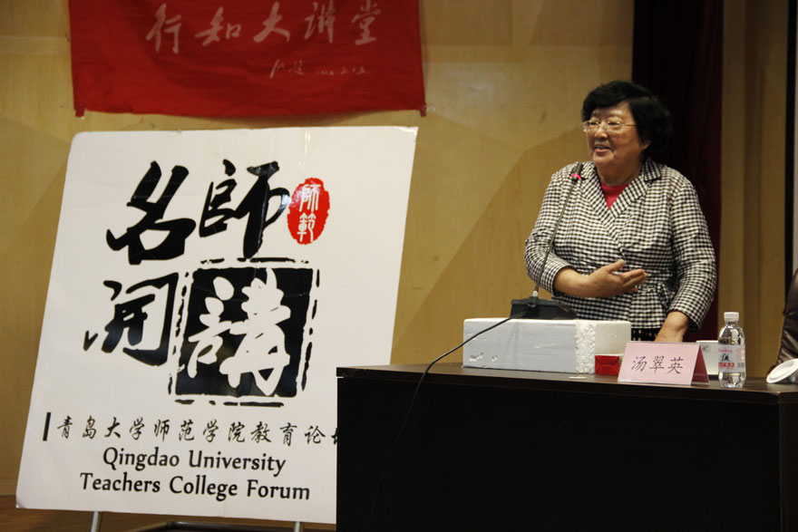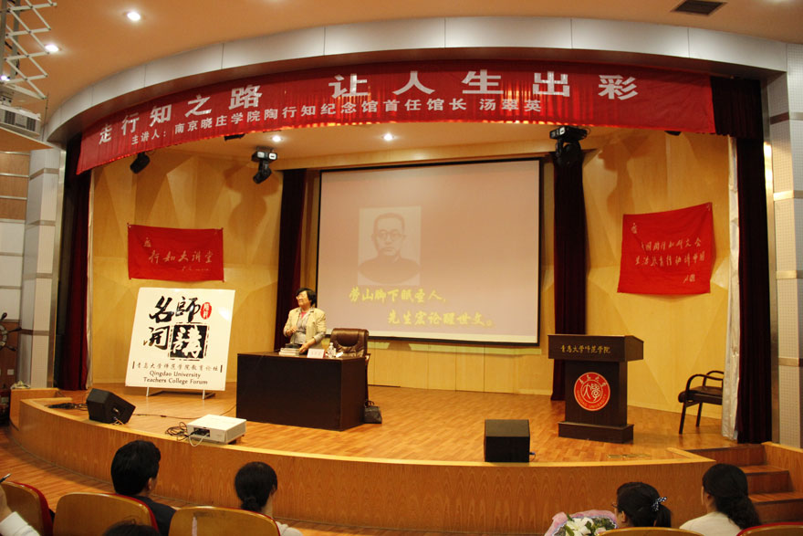 5月26日,由师范学院团委主办、院学生会学术部承办的“名师开讲”活动第五期在院学术报告厅举行。特邀“行知思想播种人”—南京晓庄学院陶行知纪念馆首任馆长汤翠英做了题为“走行知之路,让人生出彩”讲座。青岛大学校长助理、师范学院常务副院长钱国旗、院团委书记郝伟、小教、学前系主任孙玉洁、马玉宾以及青岛市陶行知协会秘书长李淑芳等老师出席了本次讲座;院团委副书记苟煜林主持讲座。