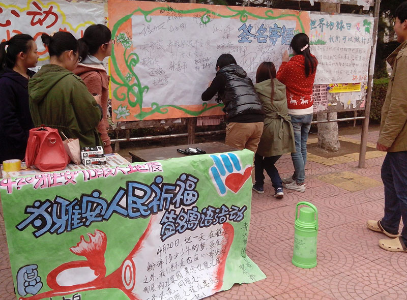 4月22日是第44个地球日,由我院团委主办、环保协会承办的“美丽中国,美丽校园,祈福雅安”世界地球日暨祈福雅安活动于当日展开,协会携手学校餐厅共同举办“节约粮食,健康饮食,拒绝使用一次性餐具”主题活动;在宣传环保知识、节约水资源、做好垃圾分类工作的同时,呼吁大家关注雅安震况,为雅安人们送上真心祝福。