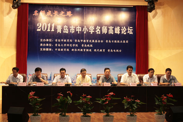 9月5日上午9时,2011年青岛市中小学名师高峰论坛精彩开幕,本届论坛由青岛市教育局、青岛市教育发展基金会、青岛日报报业集团主办,青岛大学师范学院、青岛晚报承办。在开幕式上,青岛市教育局副局长张锡科,青岛大学校长助理、师范学院院长钱国旗,青岛日报报业集团副总编辑、青岛晚报总编辑齐建国分别致辞,青岛市教育学会会长陈显青、华东师范大学教科院院长丁钢以及市教育局人事处、教育发展基金会的负责人出席。齐鲁名师、青岛市中小学名师培养工程人选、青岛大学师范学院专家、相关学校负责人、家长及学生代表共300余人参加了会议。