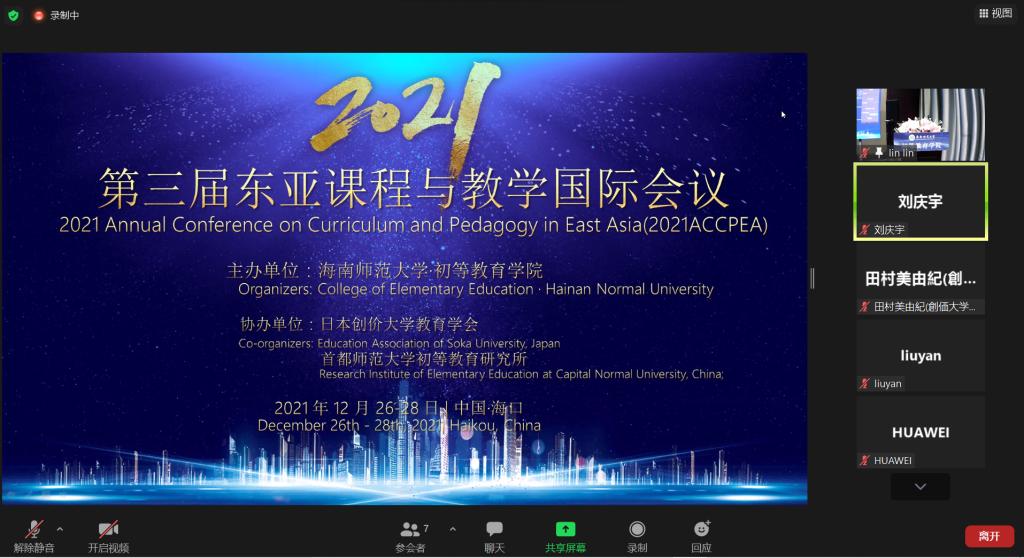 12月26-28日,由海南师范大学初等教育学院主办,首都师范大学初等教育研究所以及日本创价大学教育学会协办的第三届东亚课程与教学国际会(2021ACCPEA)在海南师范大学隆重举行。我院马勇军教授受邀参会,并在会上做名为“理实相融的中小学教学模式协同创生研究”的主旨发言。