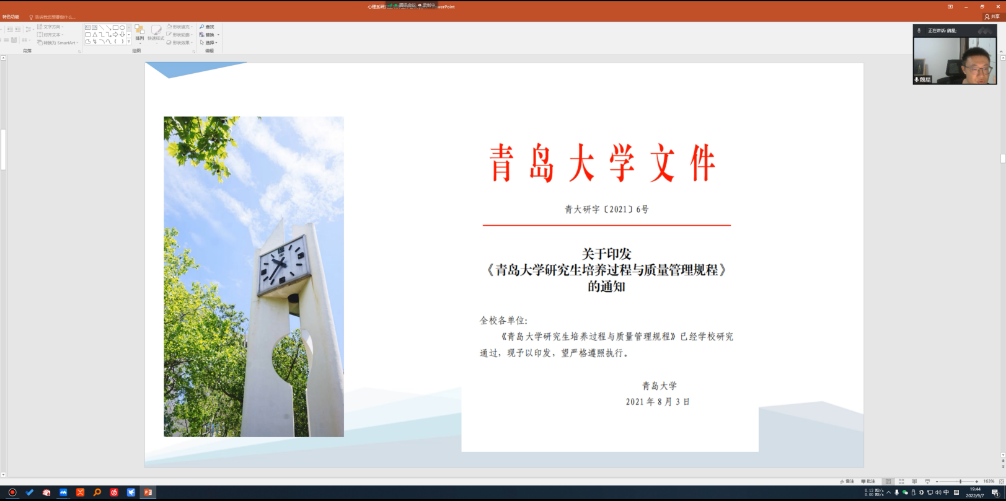 魏星依据《青岛大学研究生培养过程与质量管理规程》对研究生培养的关键问题进行了介绍,让同学们对研究生整个培养阶段包括培养方案、课程、开题、中期筛查、毕业要求等方面有了全面清晰地认识。