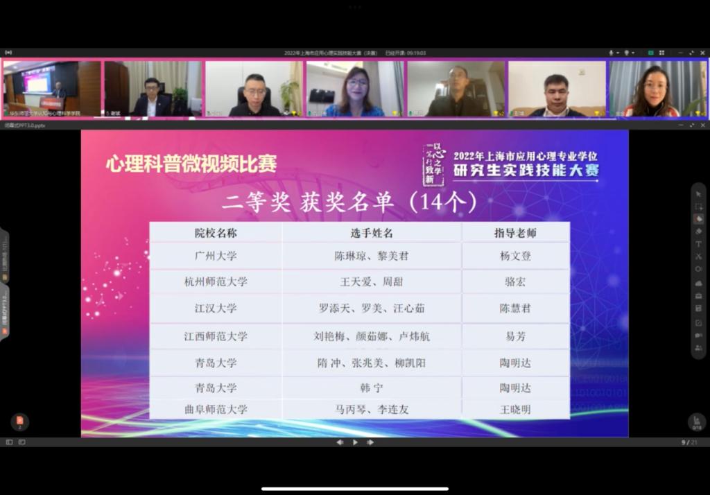 11月27日,2022年上海市应用心理心理专业学位研究生实践技能大赛决赛圆满落幕。由师范学院副院长、心理学系主任陶明达教授指导的微视频作品《被你忽略的归因真相》(韩宁)、《残翼·铠甲》(隋冲、张兆美、柳凯阳)从百余参赛作品中脱颖而出,双双荣获二等奖。