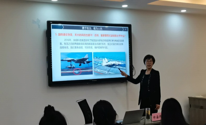 郑海燕从党的二十大报告中关于“建军一百年奋斗目标”切入,引出当代强军新局面。深入讲解了近几年航母发展情况、舰载机起飞方式等,使入党积极分子们充分了解了当今世界军事格局和我国当前的的国防地位。随后,以“中国电磁弹射之父”马伟明院士的故事为主线,以“勇于担当,敢为人先”“淡泊名利,制胜深蓝”“驾辕拉套,提携后辈”三个专题讲解了马伟明院士的伟大精神。呼吁同学们向马伟明院士学习,专注科研、执着梦想、担当报国,将自己的全身心凝聚在自己的梦想、国家的梦想上,应将国家需求视为己任,将淡泊名利挂于心间,时刻为中华民族伟大复兴的中国梦而奋斗。