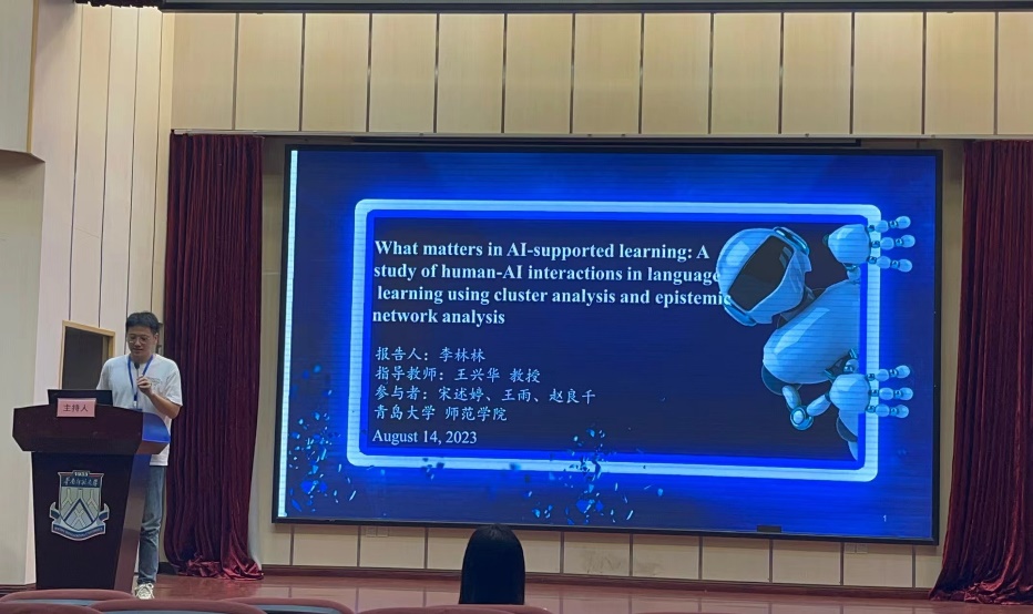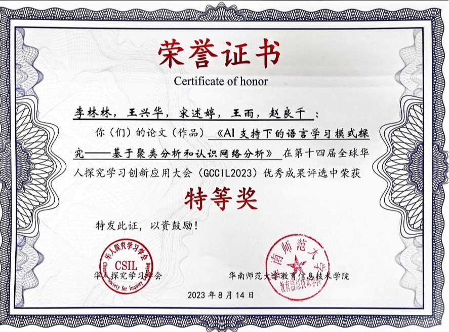 我院人工智能教育实验室王兴华教授研究团队硕士生李林林在会上汇报展示了题目为“AI支持下的语言学习模式探究——基于聚类分析和认识网络分析”的学术论文。该会议论文,以硕士生李林林为第一作者,王兴华教授为通讯作者,宋述婷,王雨,赵良千为共同作者,荣获特等奖。该论文运用聚类分析和认识网络分析深入探究了六年级学生在使用AI教师进行英语学习时的具体情况及其与AI的交互模式,发现深度学习能放大AI个性化指导的优势并增强学习社区感,而学生被动或机械地与AI交互则可能会降低其学习社区感并取得较差成绩。