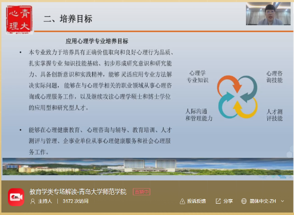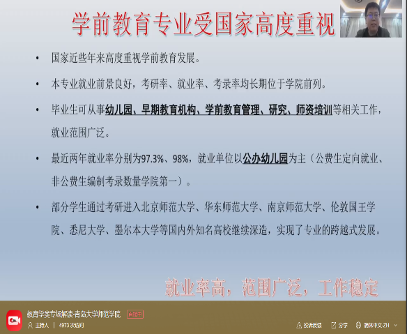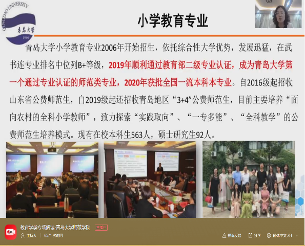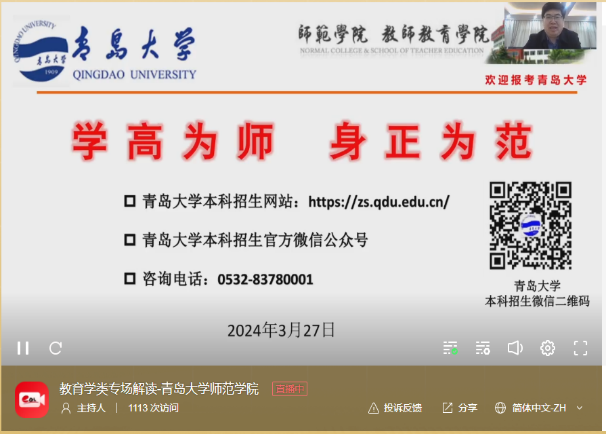 3月27日16:00-17:00,我院在德润楼201会议室举行了2024年青岛大学师范学院本科招生宣讲咨询直播活动,直播主题是“学高为师,身正为范”。院长助理王忠厚、学前教育系书记卜凡帅、心理学系副主任张黎、小学教育系副主任史凡进驻直播间,为广大考生和家长答疑解惑。王忠厚从学院概况、专业特色、人才培养、升学就业、校园文化、招生计划等方面对学院及学科进行了全方位宣讲,在直播过程中,各系教师与考生和家长们就专业报考、就业方向和升学情况等问题进行了线上交流,互动热烈,起到了良好的宣传效果。招生宣讲直播受到了好评,直播间互动热烈,参与在线直播1.2万余人。