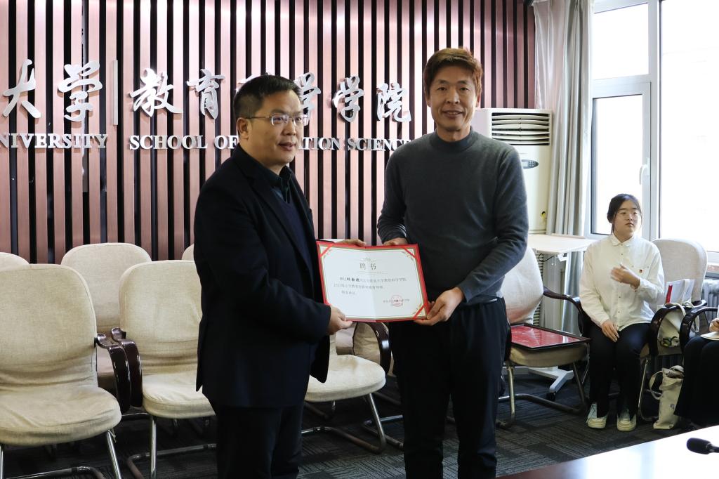 会上,教育科学学院院长孙百才为胡钦晓颁发 “德育导师”聘书。