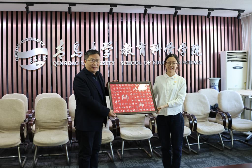 胡钦晓向同学们赠送《教育的真谛》等教育学经典丛书,教导同学们打造教育内核,实现创新飞跃。安冉代表全班同学向胡钦晓赠送“百师图”手做文创产品。