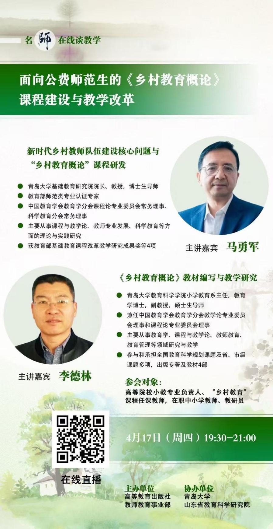 4月17日,青岛大学基础教育研究院院长马勇军教授与教育科学学院小学教育系主任李德林副教授应邀参加高等教育出版社组织的“名师在线谈教学”系列讲座活动,通过线上方式进行了主题为“面向公费师范生的《乡村教育概论》课程建设与教学改革”的专题讲座宣传。