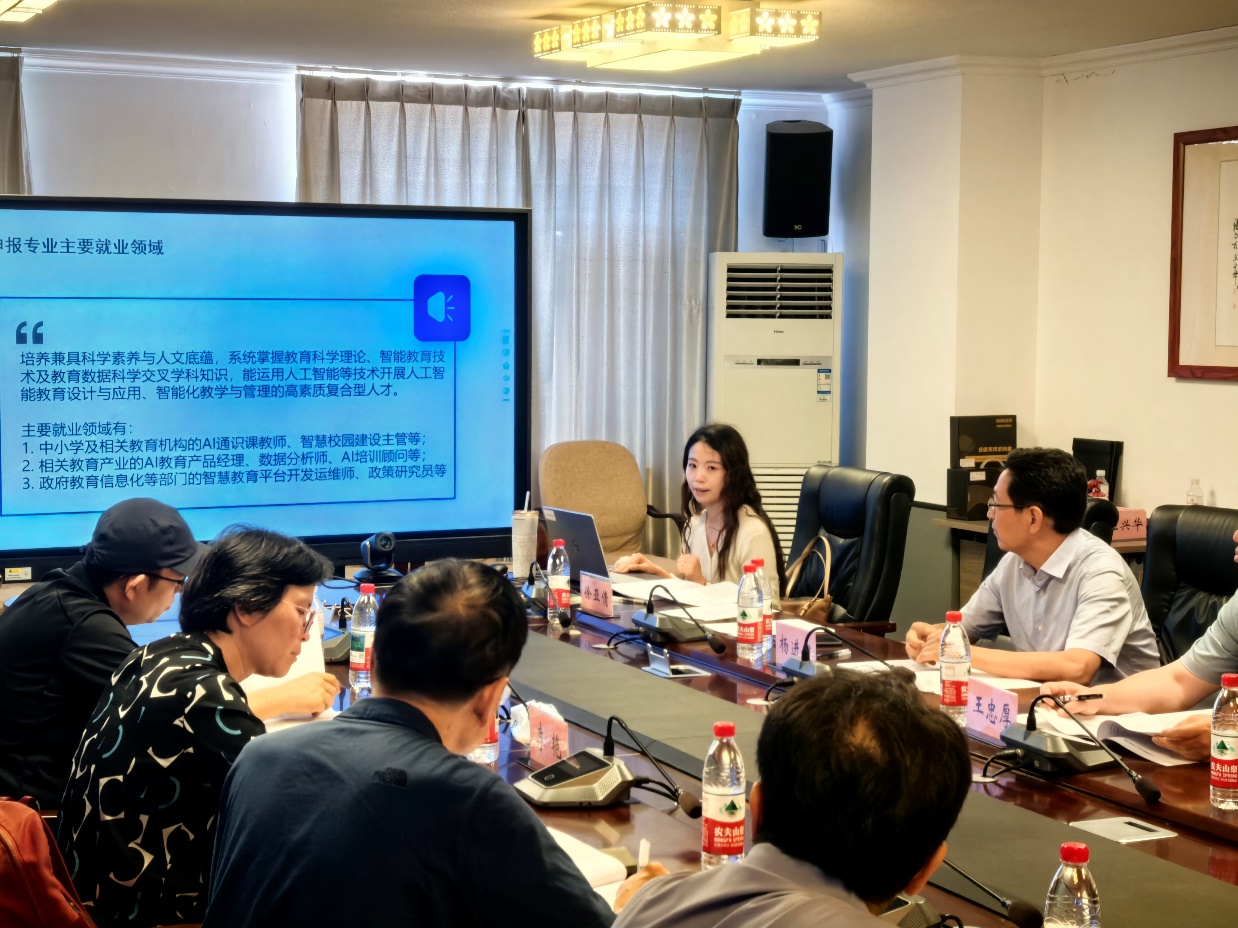 随后,教育技术系主任杨进中、教师徐亚倩分别就教育技术学专业发展情况及 “人工智能教育” 专业申报的前期调研、培养方案设计、课程体系构建、人才队伍建设等材料准备情况进行了详细汇报。