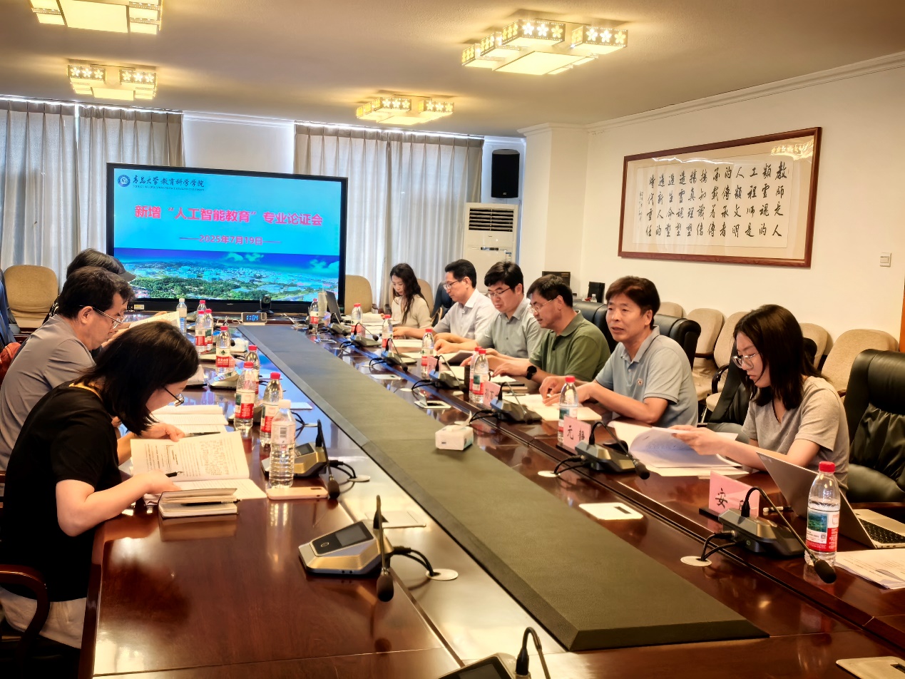 为响应国家数字化转型战略,推动中小学人工智能教育应用创新人才培养,2025年7 月 19 日上午,教育科学学院在德润楼 301 会议室召开新增 “人工智能教育” 专业论证会。本次论证会邀请了江南大学人文学院院长陈明选教授、浙江大学教育学院副院长李艳教授、青岛市信息科技教研员陆德旭老师、青岛大学计算机科学技术学院副院长杜祥军教授、青岛大学计算机科学与技术系黄宝香教授为评审专家。教育科学学院党委书记刘清亮,院长孙百才,副院长王忠厚,院长助理元静,教育技术系主任杨进中,教育技术系徐亚倩、安欣等教师出席会议。论证会由刘清亮书记主持。