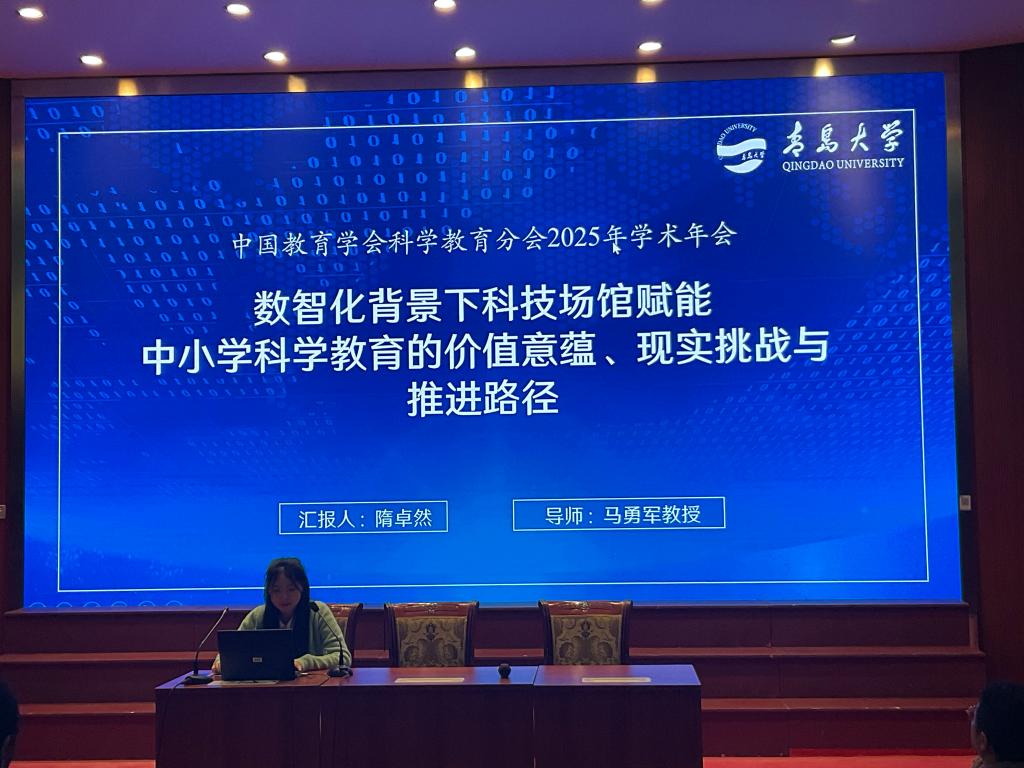 我院师生受邀参加。会上首先进行了理事换届选举,我院教授,青岛大学基础教育研究院院长马勇军当选为第三届理事会常务理事。会议期间,举办多场学术报告与交流活动,我院2024级小学教育研究生隋卓然在分论坛上分享了关于数智化时代下科技场馆赋能中小学科学教育的学术论文。