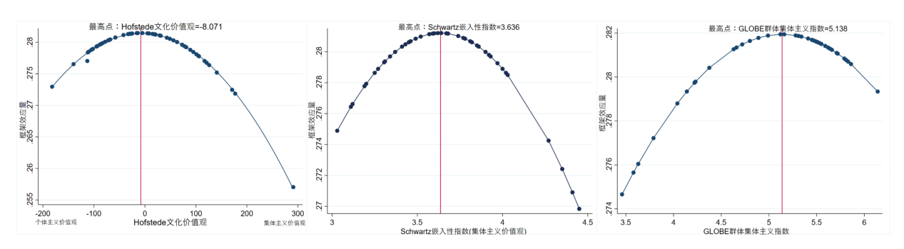 基于三种文化指数(Hofstede文化价值观/Schwartz嵌入性指数/GLOBE群体集体主义指数)与风险偏好的Logit回归结果,进行边际效应分析计算各国家(地区)的框架效应量,即框架效应量=边际效应量=|损失框架中风险寻求的概率−获得框架中风险寻求的概率|。进而分别对三种文化指数对应的所有国家(地区)的框架效应量进行拟合,结果表明文化价值观与对应的框架效应量呈倒U型曲线。该发现验证了心理博弈理论。其核心机制可以解释为:文化价值观通过具体的社会规范,为身处其中的人们建立了一套内在的“价值信念”。当文化特征鲜明时,这套信念系统会为决策提供清晰、直接的指导,这大大削弱了外部语言框架的影响,因此框架效应会减少。反之,当文化特征不鲜明时,个体因缺乏明确的内在规范指引,决策时便会更加依赖外部的场景信息,导致框架效应增强。