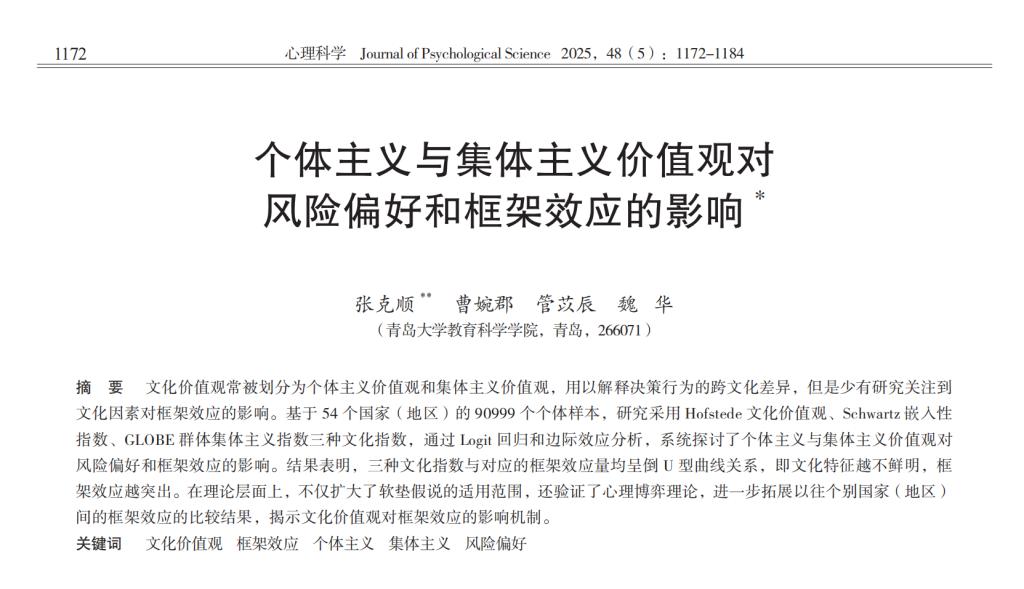 近日,教育科学学院张克顺教授团队在《心理科学》发表论文“个体主义与集体主义价值观对风险偏好和框架效应的影响”。研究基于54个国家(地区)90999个样本的跨文化数据,运用三种主流文化指数Hofstede文化价值观、Schwartz嵌入性指数、GLOBE群体集体主义指数,系统探讨了个体主义与集体主义价值观对风险偏好和框架效应的影响。