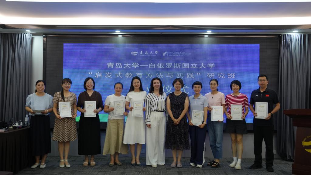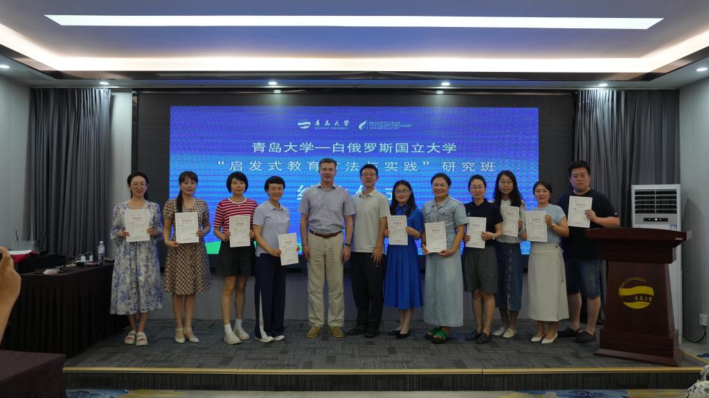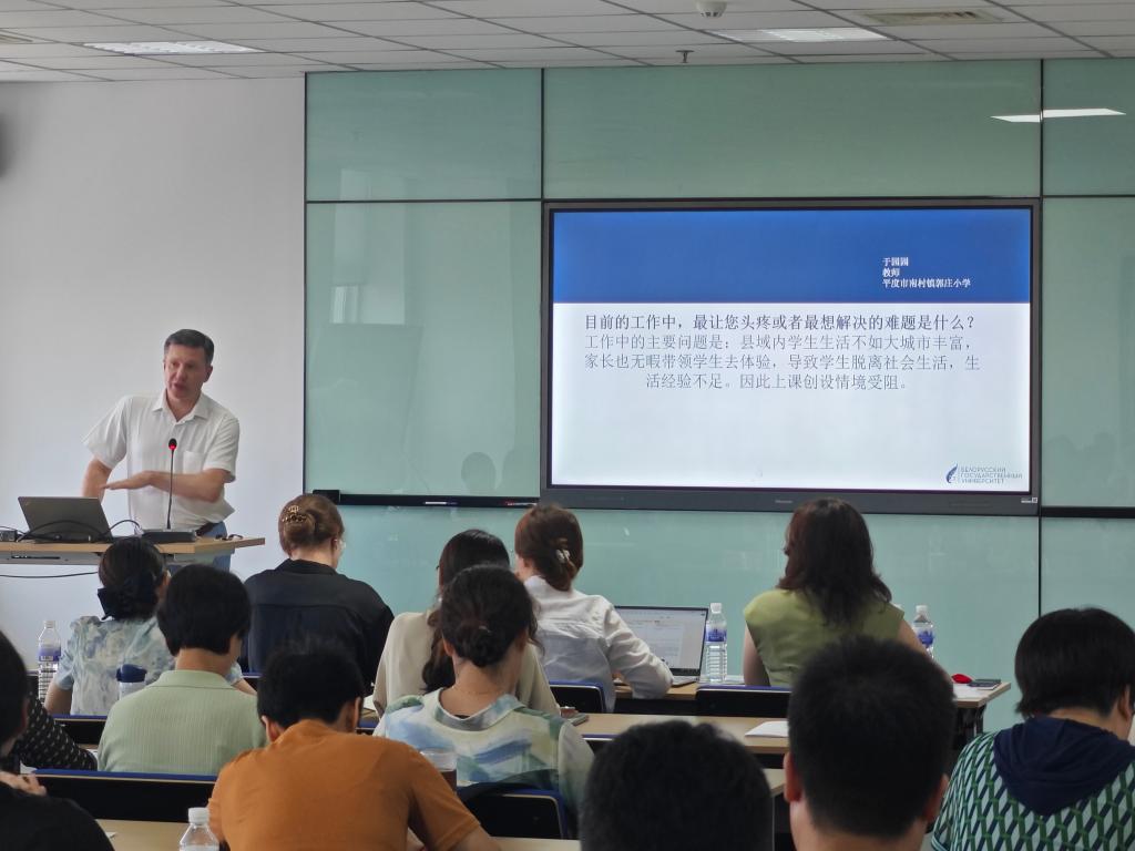7 月4 日至9日,青岛大学、白俄罗斯国立大学携手为青岛市第五期名师培养工程(义务教育学段)学员们组织了富有国际视野与教育情怀的“启发式教育方法与实践”工作坊。白俄罗斯国立大学校长安德烈・德米特里耶维奇・科罗尔教授全程六天进行授课,通过理论讲授、实践演练、点评研讨等多元形式,为名师学员们搭建了从理念认知到落地实践的启发式教育体系。青岛大学校长魏志强,青岛市教育局二级调研员张文学,青岛大学教育科学学院党委书记刘清亮、院长孙百才在开班仪式上致辞。