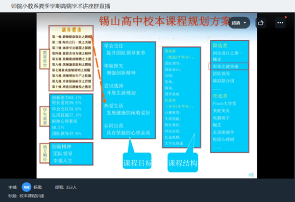杨璐以解读校本课程概念区分“综合实践活动”与“校本课程”的不同入手,从学生、学校、教师三个角度阐释校本课程的重要性;结合2022版新课标内容,以上海市华东理工大学附属小学为例,介绍学校课程开发的一般程序和实施框架,展示基于学生核心素养的学校课程建设的六种水平;以锡山高中校本课程规划方案为例,说明如何从学生需求、课程目标、课程结构入手做好校本课程规划。