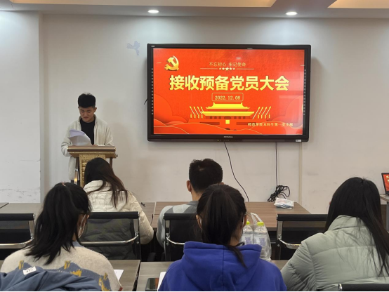 2022年12月8日,师范学院本科生第一、第二党支部分别于德润楼201会议室、德音楼615教室召开接收预备党员大会。两支部全体党员同志与党员发展对象参会,本科生第一党支部书记张宁、本科生第二党支部书记姜彬主持会议。