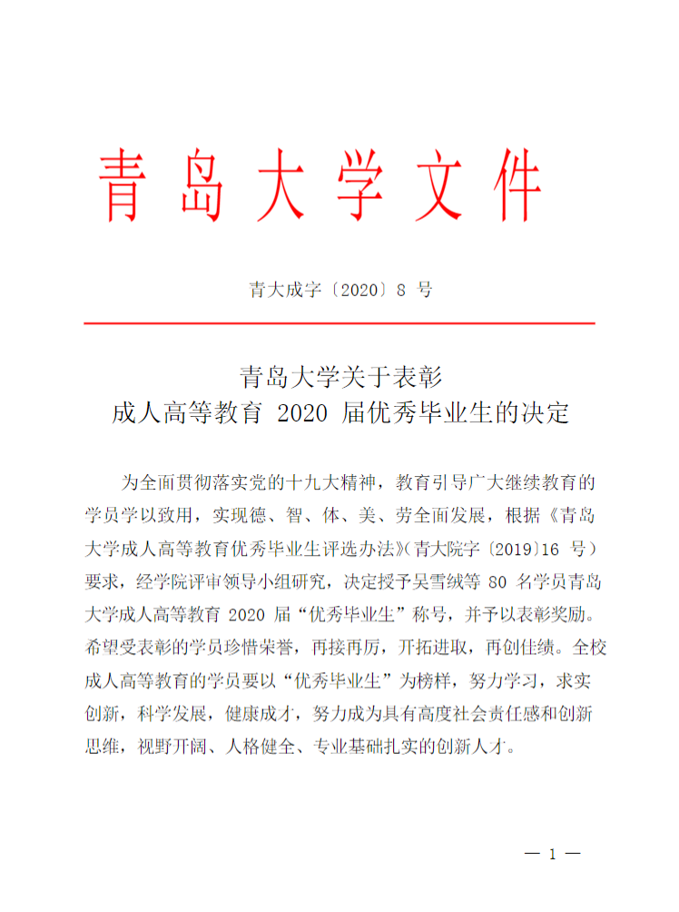 为全面贯彻落实党的十九大精神,教育引导广大继续教育的学员学以致用,实现德、智、体、美、劳全面发展,近期公布的《青岛大学关于表彰成人高等教育2020届优秀毕业生的决定》(青大成字〔2020〕8号),授予吴雪绒等80名学员青岛大学成人高等教育2020届“优秀毕业生”称号,并予以表彰奖励。