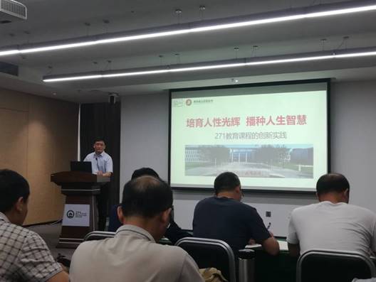 6月27日上午,峡山实验初中魏传国副校长做题为《培育人性光辉,播种人生智慧》的报告。报告中,魏校长旁征博引,并结合本校的实例,条理清晰地讲述了271教育集团教育课程创新实践的历程。大家对271教育的教育目标、教育哲学、教育课程性质及核心理念、课程整合的落实及导学案的制作和使用等方面有了深刻的认识。