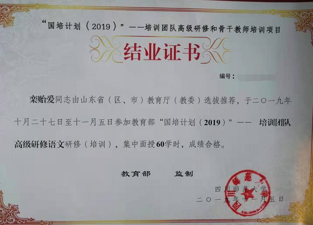 近日,由我院推荐并给予经费支持的语文教育专业课程教学论任课教师栾贻爱赴四川师范大学参加“国培计划”(2019)——培训团队高级研修语文(高校或教师培训机构)项目培训,并在完成相关课程学习后顺利取得结业证书。
